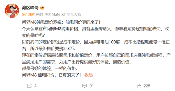 據介紹,求和問界M8產品經理“@ 灣區峰哥”發文解釋了問界M8純電定價邏輯: